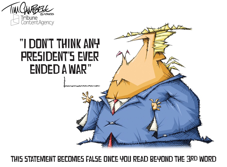 Share Facebook Twitter LinkedIn Pinterest Email A cartoon by Tim Campbell. Related | Guess how many wars Trump thinks he’s ended. No, higher. Cartoon Partly true