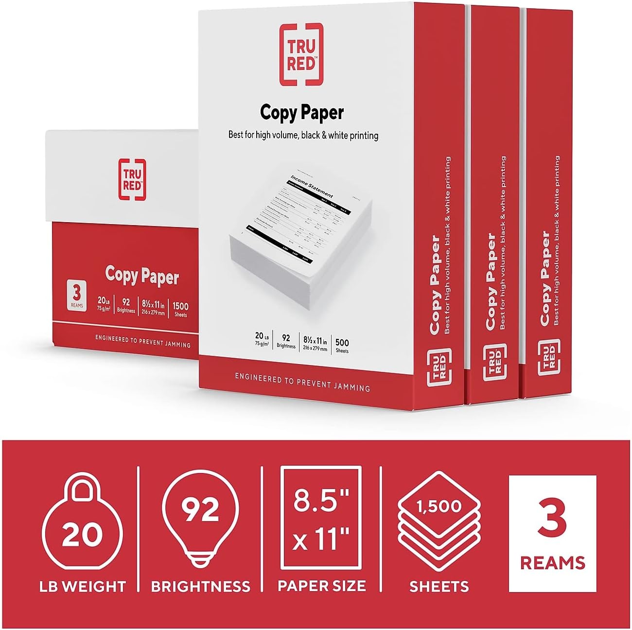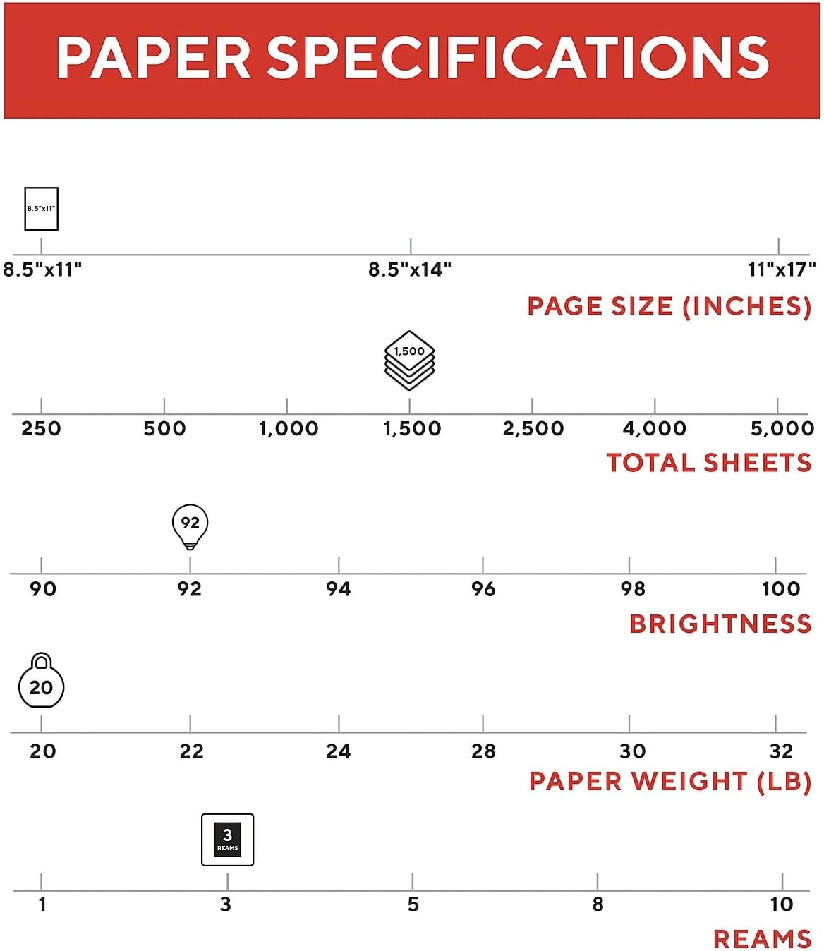 Engineered to prevent jamming. Paper dimensions: 8.5″W x 11″L (US letter). White color. 500 sheets per ream, 3 reams per carton, 1500 sheets total.